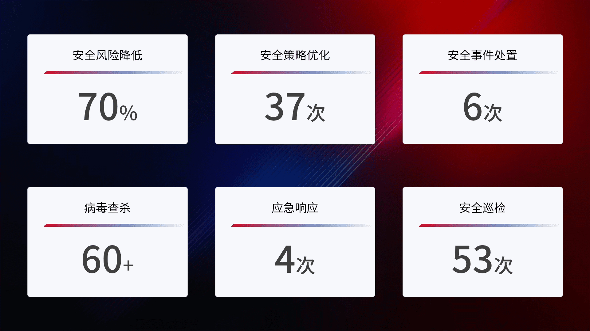 提供全面的安全事件报告体系,,包括处置报告、、周报、、、季度和年度总结,,结合持续监控,,,,帮助客户深入了解网络安全状况。。。。